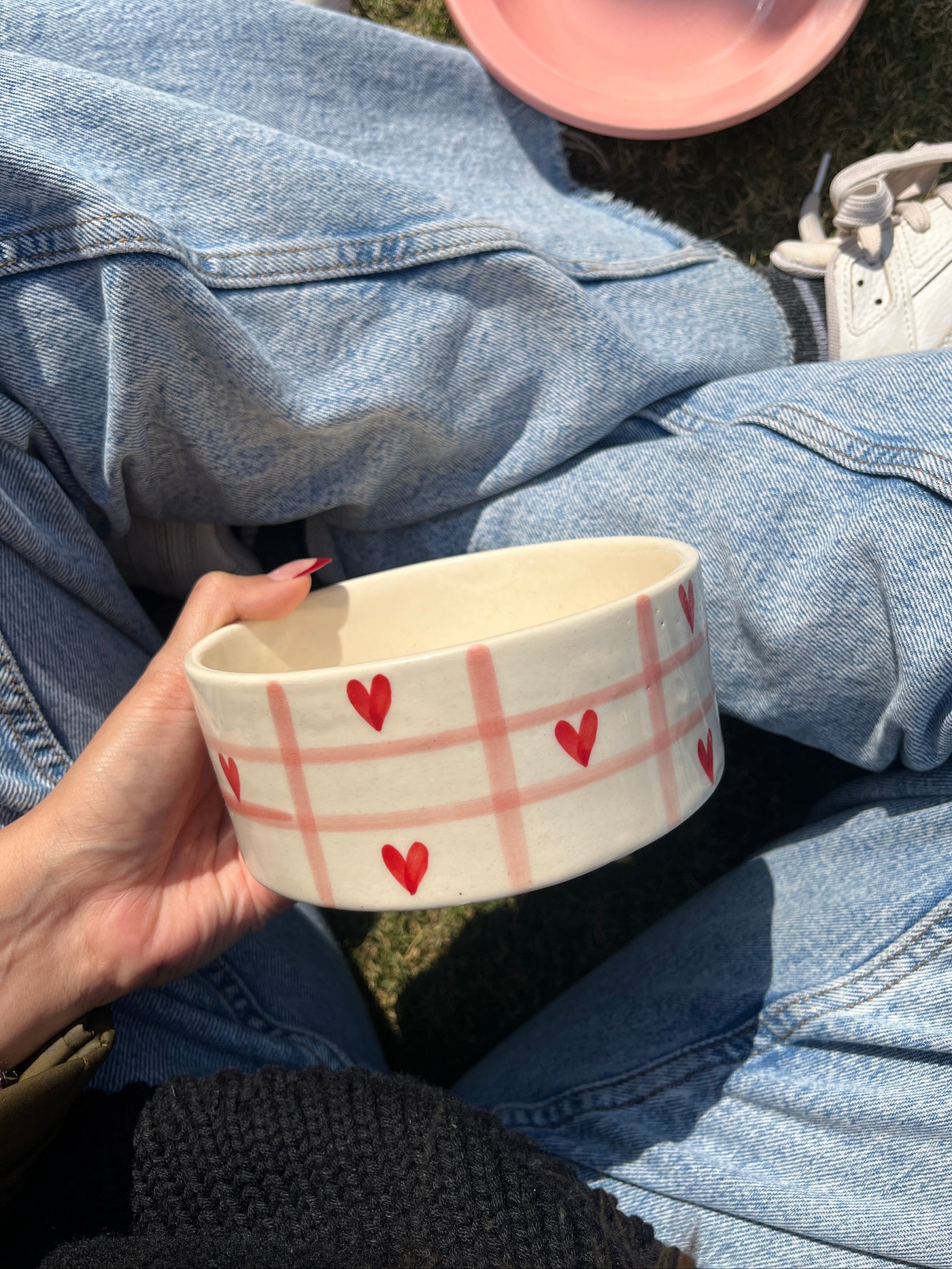 Romantic, versatile, and thoughtfully detailed, the Dolce Bowl is designed to make everyday servings feel a little more special. Crafted in ceramic with a glossy finish, it features hand-painted checks and heart motifs on the exterior, while the inside keeps it minimal with a delicate heart detail at the base. The softly curved form makes it perfect for serving pastas, fruits, desserts, or small shared bites.