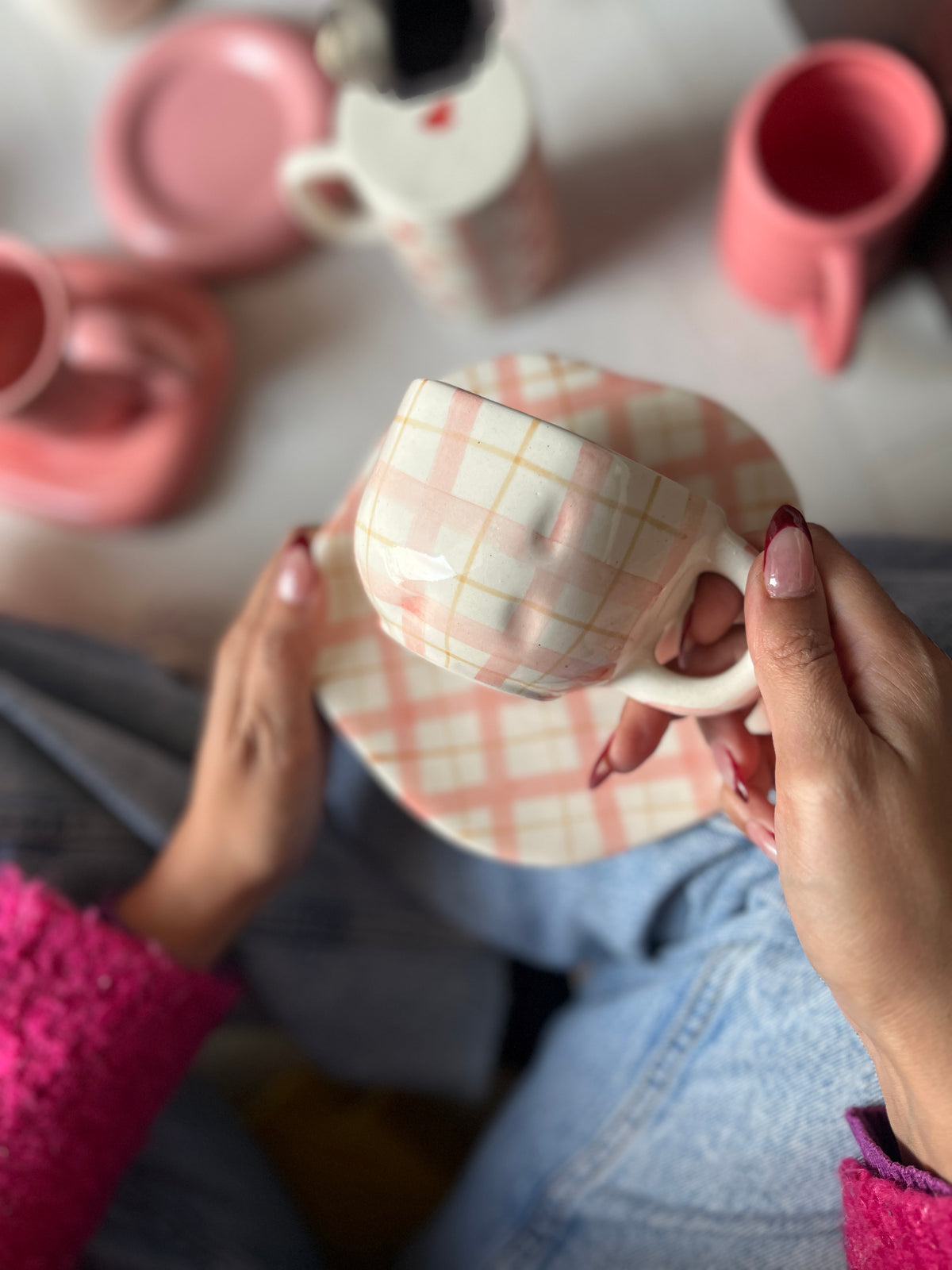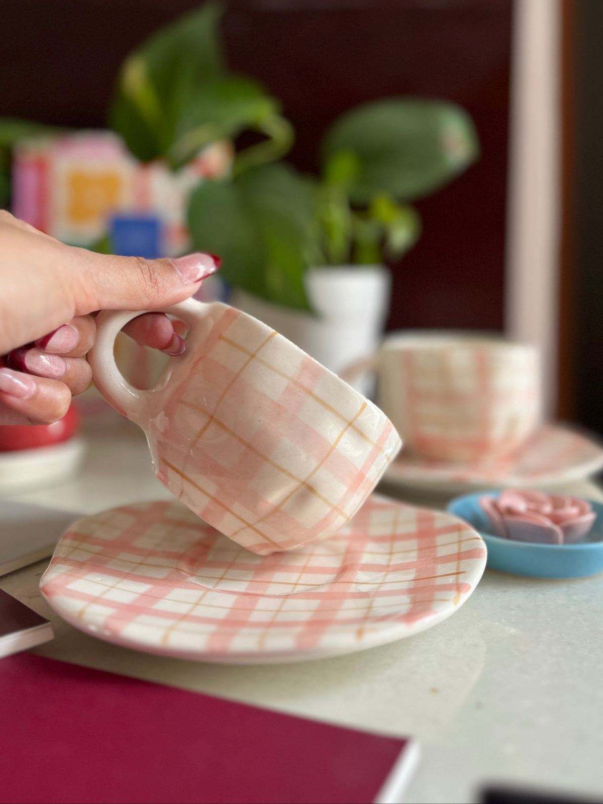 Delicate, cheerful, and made for little tea-time rituals, the Juniper Cup & Saucer Set brings a soft charm to your table. Hand-painted in a pastel gingham pattern, this ceramic set is finished with a glossy glaze that highlights its gentle colour play. Perfectly sized for tea, coffee, or evening brews, it’s designed to make every sip feel a bit more special.